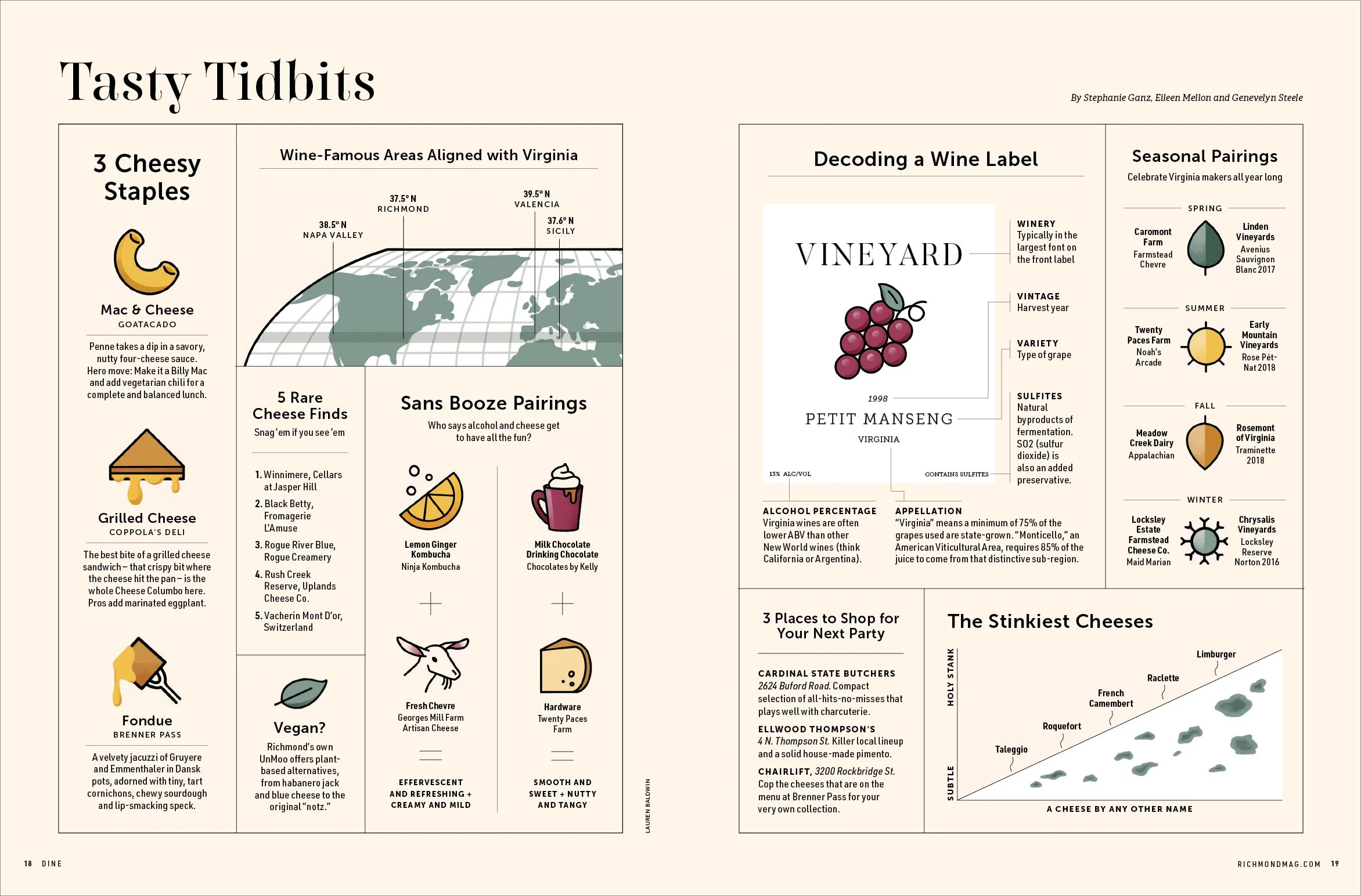 For this special publication from Richmond Magazine, I worked closely with the food editor to highlight Virginia’s wine and cheese scene. It was especially fun to brainstorm the infographic together and create the illustrations.