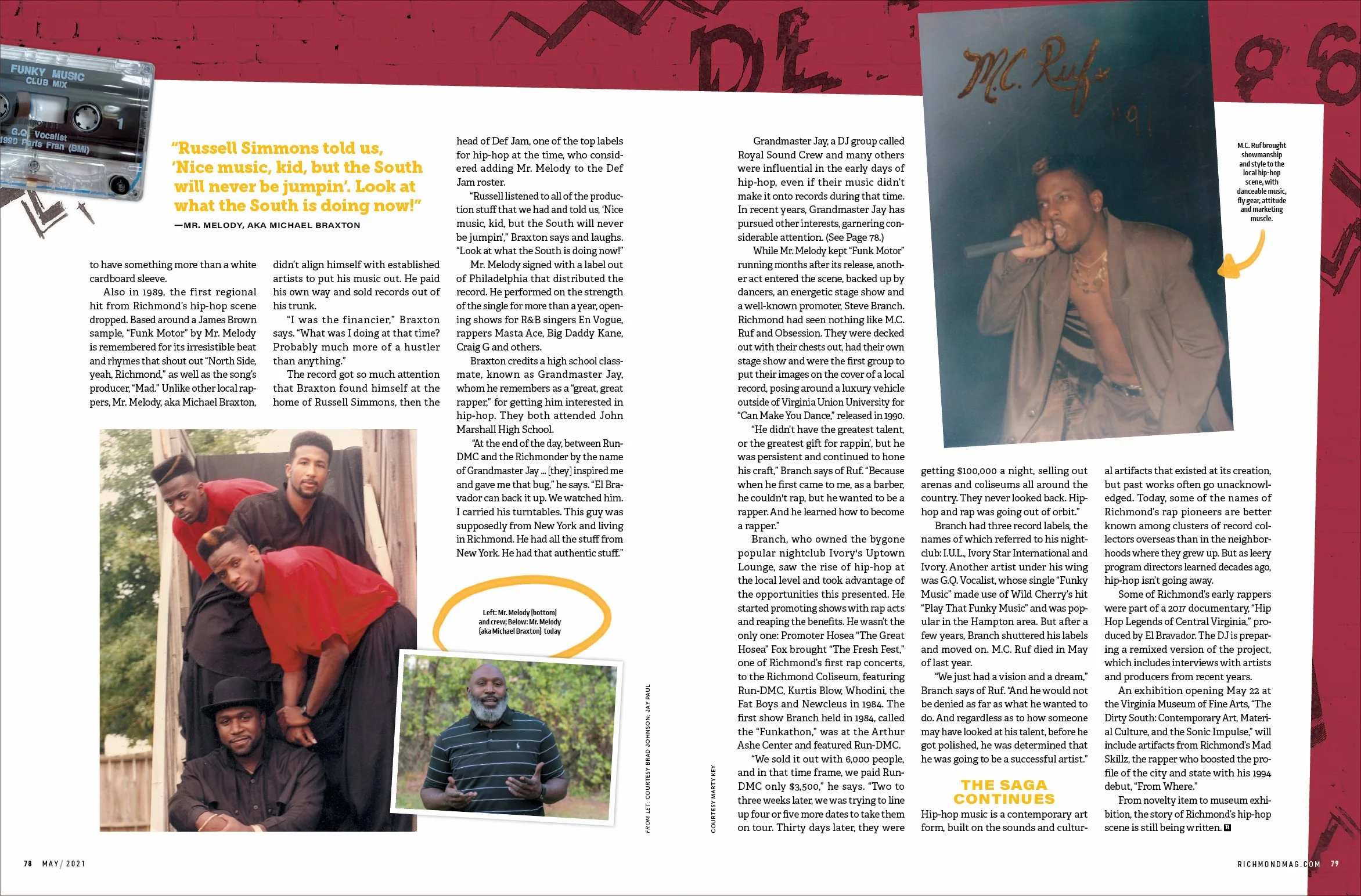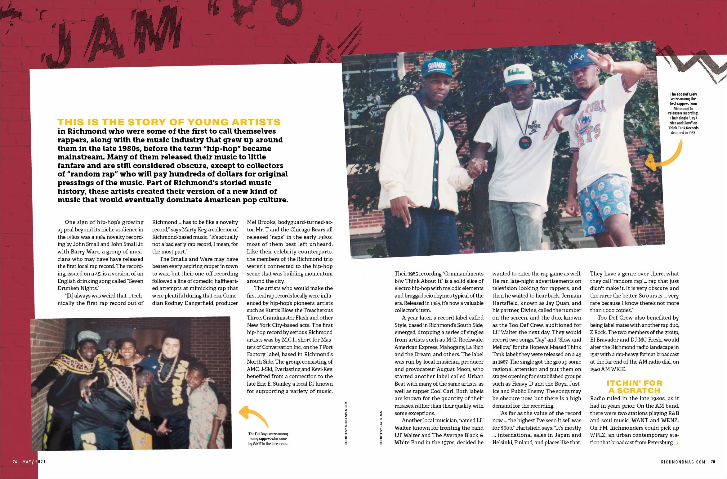 I learned so much about Richmond’s early hip hop scene while working on this feature for Richmond Magazine. The writer let me borrow some of his copies of The Source magazine and they were a big inspiration. I used collage with some hand-drawn elements for this story since there were so many great artifacts to work with.