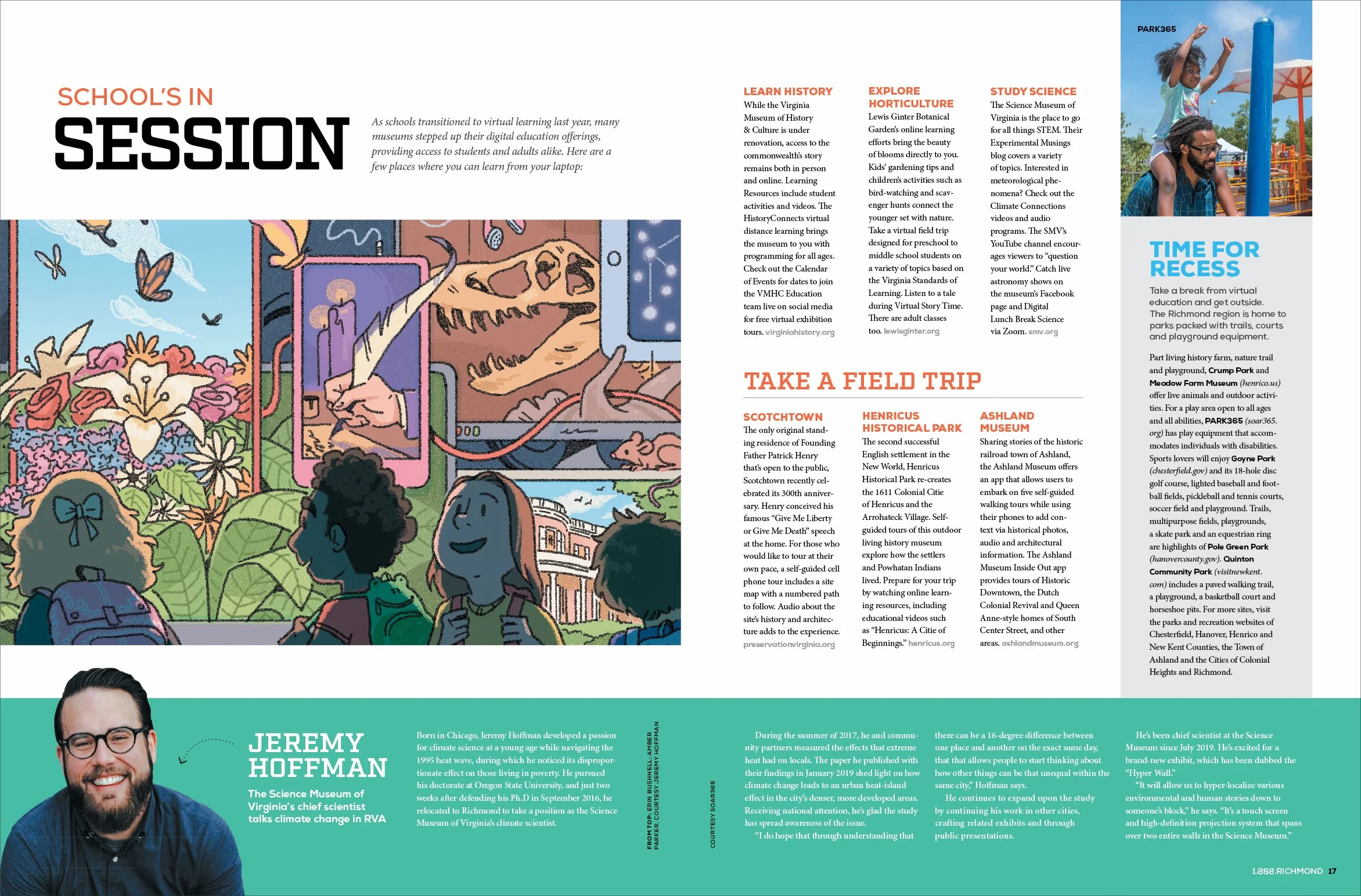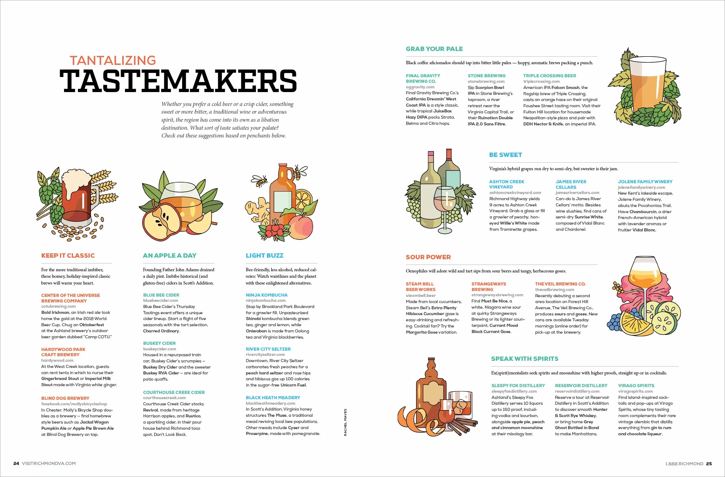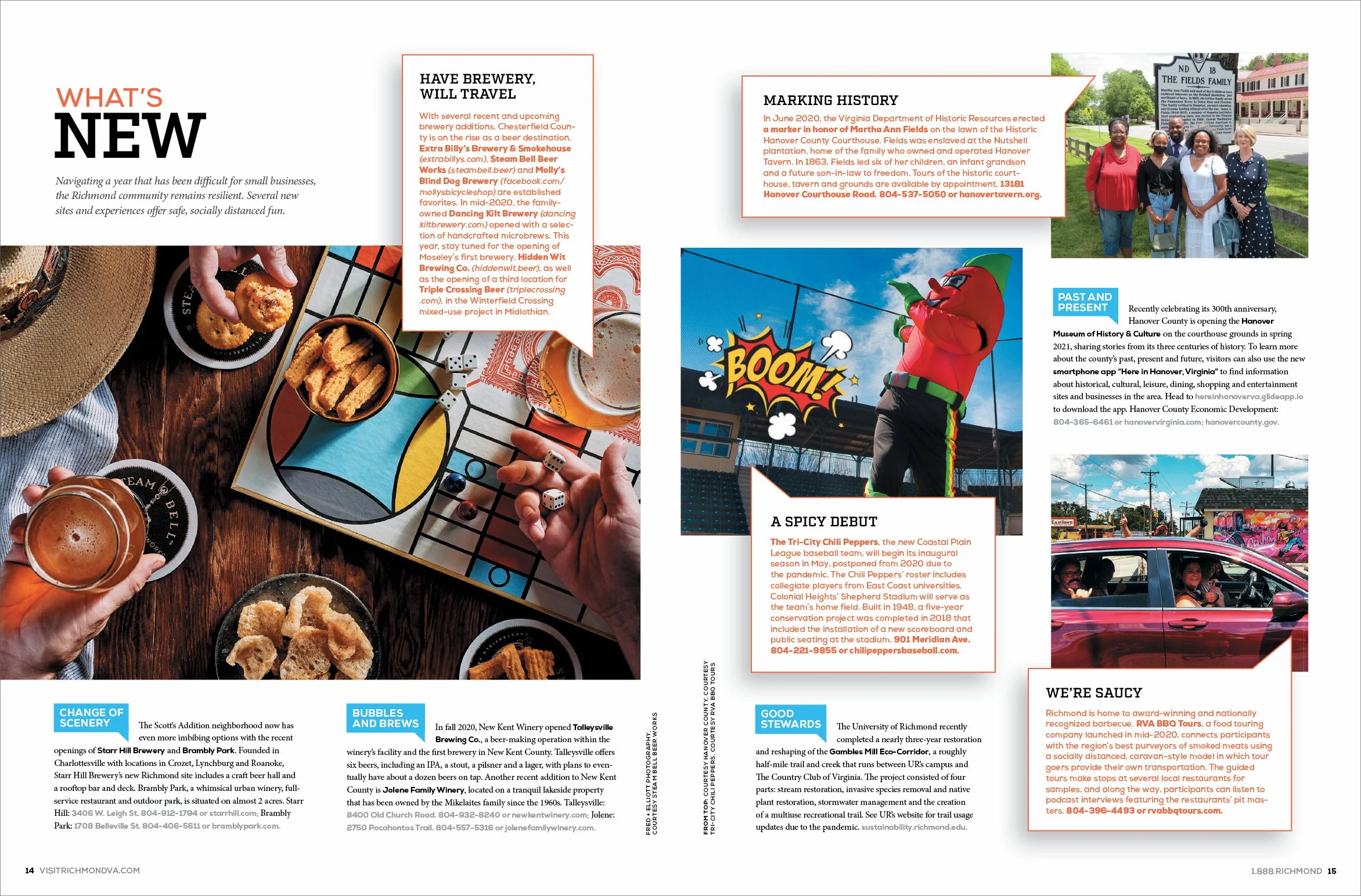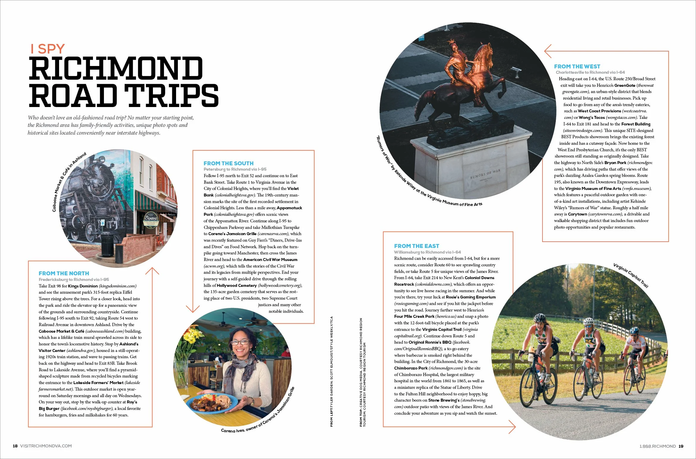 Richmond Region Tourism’s Visitors Guide includes stories, listings and charts to help visitors navigate the city. I worked with the Richmond Magazine team to create a guide that matched the tourism board’s branding and needs, including art directing the cover shoot.